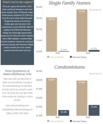 Relative to other luxury destinations-Aspen/Snowmass, Jackson Hole, Sun Valley, and Vail-Telluride’s 2025 performance reflects the same broader market reset driven by limited inventory, higher borrowing costs, and more deliberate buyers. San Miguel County continues to stand out, however, with steady high-end condo and single-family activity in both Telluride and Mountain Village and comparatively less price softening than many peer resorts. The persistence of multi-million-dollar closings shows that lifestyle buyers remain engaged, particularly for updated or turnkey properties. As winter demand builds, the market enters December with a smaller but stronger buyer pool, firm Luxury pricing, and transaction levels that remain competitive within the Rocky Mountain resort landscape.